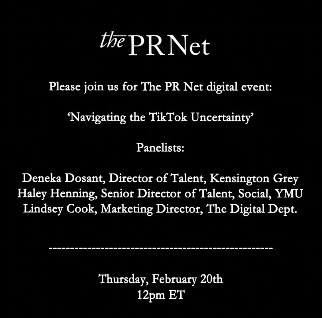 Spoke on the virtual panel “Navigating the TikTok Uncertainty” hosted by The PR Net. Fellow panelists included Deneka Dosant, Director of Talent at Kensington Grey, and Haley Henning, Senior Director of Talent and Social at YMU.